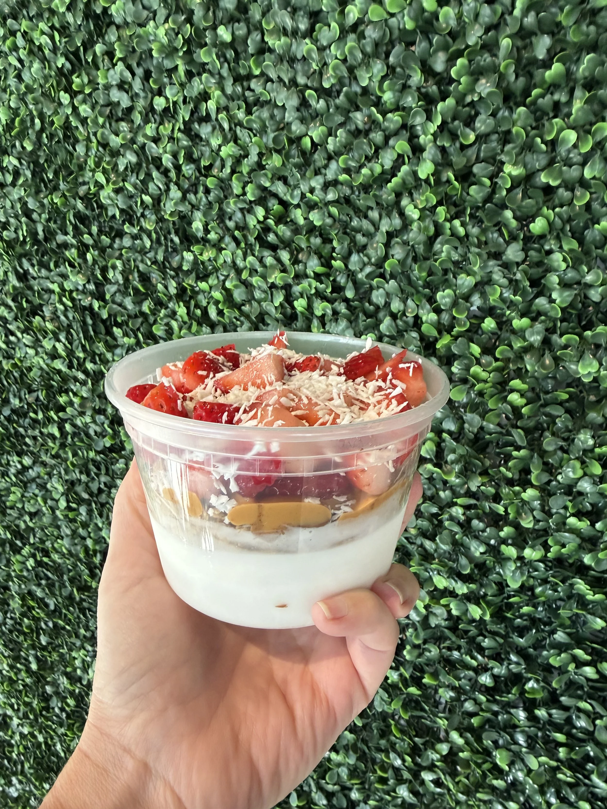 Coconut base, granola, Nutella, almond butter, peanut butter, strawberries, coconut